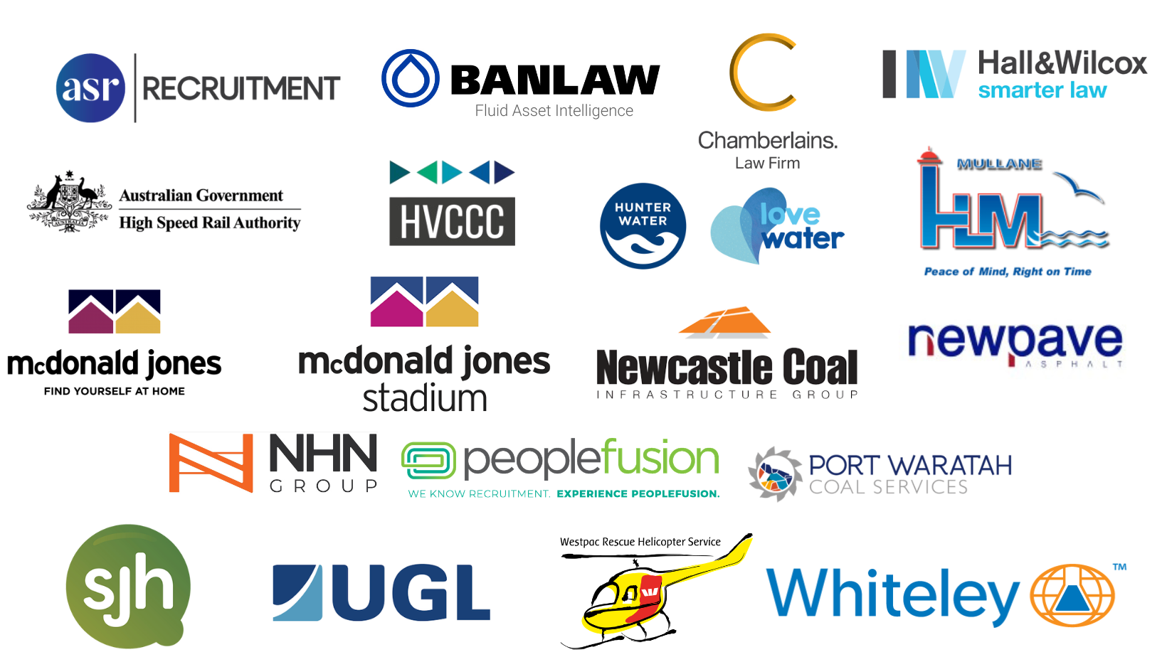 AECOM • Agilitus • Ampcontrol • Aurecon • Avondale University • Barr Planning • Breast Cancer Trails • Broadmeadow Serviced Offices • Built • Career Links • Castle Personnel • Cessnock City Council • City of Newcastle • Commercial Collective • Commonwealth Bank • CPB Contractors • Crowdcatcher • Crystalbrook Kingsley • Daracon • Dantia • Downer Group •Enigma • Enel X • Fulton Hogan • GHD • GH Varley • Hip Pocket Workwear & Safety • HCCDC • HMRI • Home in Place • Hunter Wildfires • Hunter New England Local Health District • ilume • Infrabuild • IMB Bank • Jaimie Abbott Communications •JSA Group • KBR • Keystone Lawyers • Kongsberg Defence Australia • Lake Macquarie City Council • Lake Macquarie Private Hospital • Leogate Estate Wines • Little National Hotel • Maitland City Council • Mapien • Maxim Business Advisors • Macquarie Manufacturing • Moir Landscape Architecture • Monteath & Powys • Multiplex • Myrtec • Newcastle Jockey Club • Osborn Law • Out of the Square • Pettigrew Family Funerals • PKF • Port Authority of New South Wales • PricewaterhouseCoopers • Primary Health Network • Projence • Quarry Mining • Robson Civil • Salter Bros • Saphi Pty Ltd • Senversa Pty Ltd• SHAPE • Solutions Plus Grow • Sparke Helmore Lawyers • Strikeforce Services • Southern Cross Austereo • Swietelsky Rail • TAFE NSW – North • The Bloomfield Group • Tomago Aluminium • Torra Staffing and Recruitment • Umwelt (Australia) • Verve Partners • Whitehaven Coal Limited • WSP Australia • Zeal Futures