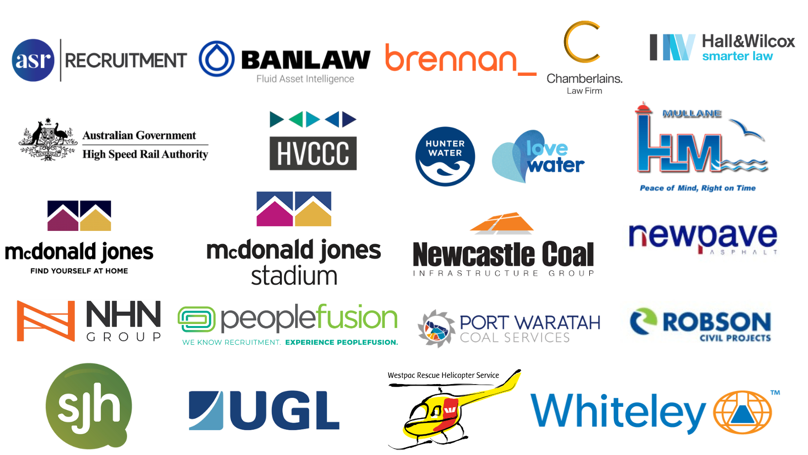 AECOM • Agilitus • Ampcontrol • Aurecon • Avondale University • Barr Planning • Breast Cancer Trails • Broadmeadow Serviced Offices • Built • Career Links • Castle Personnel • Cessnock City Council • City of Newcastle • Commercial Collective • Commonwealth Bank • CPB Contractors • Crowdcatcher • Crystalbrook Kingsley • Daracon • Dantia • Downer Group • EML Group •Enigma • Enel X • Fulton Hogan • GHD • GH Varley • Hip Pocket Workwear & Safety • HCCDC • HMRI • Home in Place • Hunter Wildfires • Hunter New England Local Health District • ilume • Infrabuild • IMB Bank • Jaimie Abbott Communications •JSA Group • KBR • Keystone Lawyers • Kongsberg Defence Australia • Lake Macquarie City Council • Lake Macquarie Private Hospital • Leogate Estate Wines • Little National Hotel • Maitland City Council • Mapien • Maxim Business Advisors • Macquarie Manufacturing • Moir Landscape Architecture • Monteath & Powys • Multiplex • Myrtec • Newcastle Jockey Club • Osborn Law • Out of the Square • Pettigrew Family Funerals • PKF • Port Authority of New South Wales • PricewaterhouseCoopers • Primary Health Network • Projence • Quarry Mining • Saphi Pty Ltd • Senversa Pty Ltd• SHAPE • Solutions Plus Grow • Sparke Helmore Lawyers • Strikeforce Services • Southern Cross Austereo • Swietelsky Rail • TAFE NSW – North • The Bloomfield Group • Tomago Aluminium • Torra Staffing and Recruitment • Umwelt (Australia) • Verve Partners • Whitehaven Coal Limited • WSP Australia • Zeal Futures